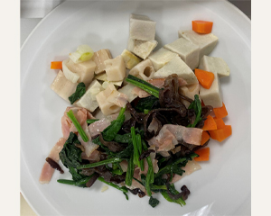 - 1 細長ネギ(1本)は小口切りに、里芋(100g)は一口大に切り、人参(1/6)・レンコン(皮を剥き30-40g)は 1㎝角に切ります。
