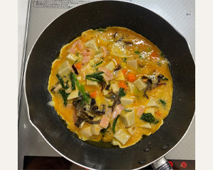 - 7 フライパンにオリーブオイル(大さじ1)を入れて6を流し入れたあと蓋をして加熱します。(弱火より少し強いぐらい)